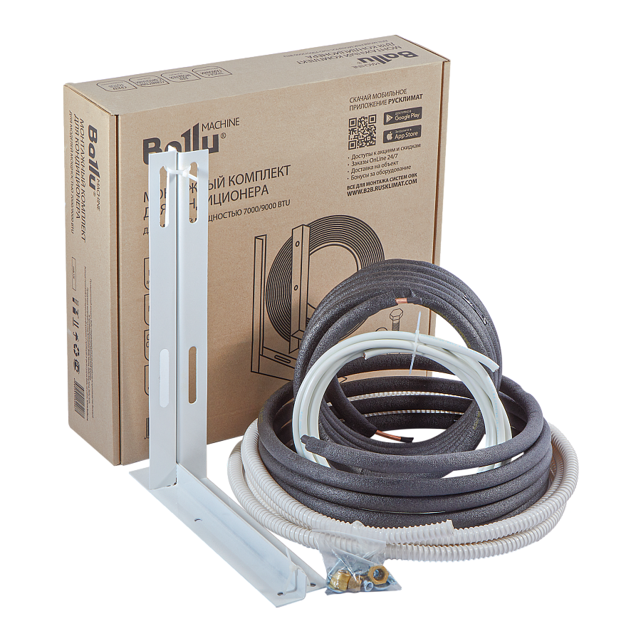 Комплект предназначен для кондиционеров 7000/9000 BTU, рассчитан на стандартную фреоновую трассу длиной 5м. Удобный кейс с ручкой включает в себя все необходимое: медную трубу в теплоизоляции - 5м (d6мм и d9мм), кронштейны (размер 415х450), дренажный шланг - 5м (d16 мм) , кабель - 4м (5х1,5), крепеж.